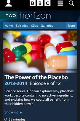 简介:They are the miracle pills that shouldn't really work at all. Placebos come in all shapes and sizes, but they contain no active ingredient. Now they are being shown to help treat pain, depression and even alleviate some of the symptoms of Parkinson's disease. Horizon explores why they work, and how we could all benefit from the hidden power of the placebo.
